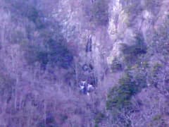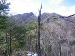林道は御巣鷹山(1640m三角点峰)の北面をトラバースする。見上げる御巣鷹山は険しい谷の奥に黒木に覆われた急峻な山肌を見せ、ちょっと興味が湧く。神流川本谷を隔てて望む諏訪山の山裾には、中止の滝が水を落としているのが見える。