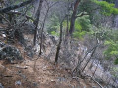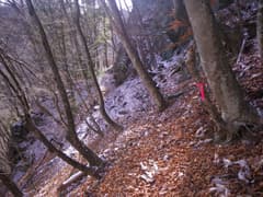 送電線巡視路はここで終わりで、この先は細尾根の上を忠実に辿る。尾根を覆う樹林は疎らで藪はなく、快適に歩ける。