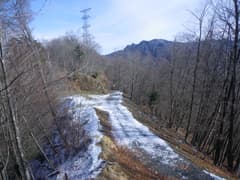 又尾山(1444m三角点峰)は巻いて通過。ゲートを通って、稜線を東西に横切る幅広い舗装道(中ノ沢林道)に出る。路面を覆う雪には車の轍が残っている。