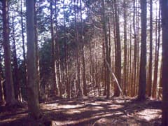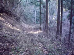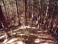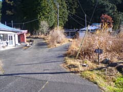 両側を浅い窪に挟まれた小尾根をズンズン下る。下部で地形図に現れない小さな尾根が分岐するが、左寄りの小尾根を下ると杉林の中に入り、明瞭な踏み跡が現れる。落ち葉を踏んで下って行くと、両側の沢が合流して尾根末端となり、荒れた林道に下り着く。あとは、林道をテレテレと下るだけである。