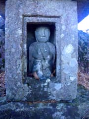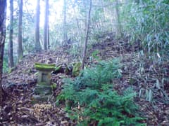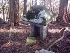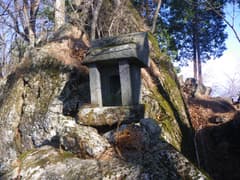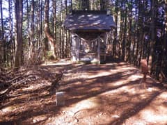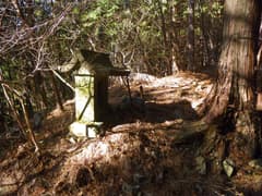 少し登り返した辺りが643m標高点で、笹目倉山から高度差約150mを下り、鶏鳴山へは約300mの登りとなる。里山歩きにしてはなかなかのアルバイトである。平坦な稜線をしばらく進むと、石祠がある。こちらは平入り入母屋造り。やがて右側に防獣ネットが現れ、これに沿って歩く。陽が差し込む所は背の低い笹が下生えとなっている。