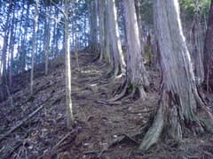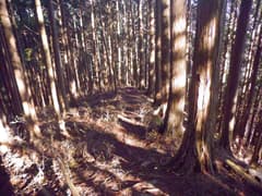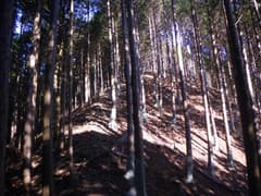 登山道は杉や檜の人工林に覆われた急な尾根をほぼ一直線に登っている。道型は細いが、足場がしっかりしていて歩き易く、グングンと気持ち良く高度を稼いで行く。