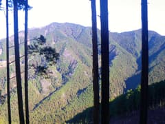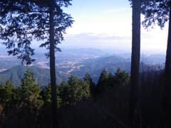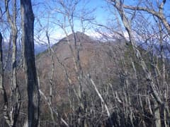 林に覆われて展望はほとんどないが、30分程登ると左側の杉林が伐採されて木立が薄くなり、鶏鳴山の意外とボリュームのある山容が望まれる。笹目倉山から鶏鳴山へ続く稜線は、間で大きく高度を落としているのが見え、結構歩き応えがありそうである。