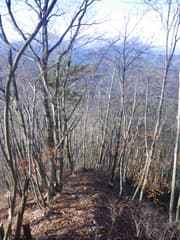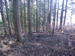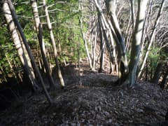 鶏鳴山への縦走路は、まず北斜面の急降下から始まる。赤テープがあり、道型も明確で良く踏まれている。杉林の中を一直線に下ると、次第に尾根筋がはっきりとしてくる。雑木林が現れると、ようやく長い下りが終わって最低鞍部に下り着く。