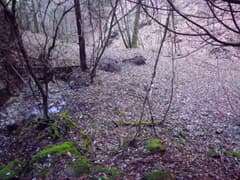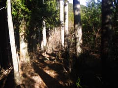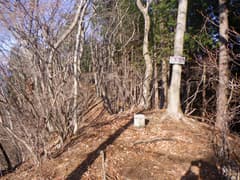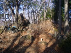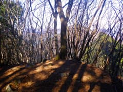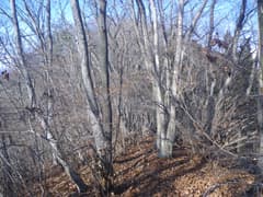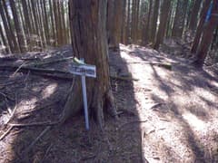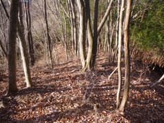 下山は西面の破線路を下る。と言っても先人の山行記録にある通り、はっきりした山道はない。北の肩から少し戻ると、杉林の中を西面に下る踏み跡と赤テープのマーキングがある。これを辿って下るが、すぐに右側の雑木林の中に大岩が見え、そちらの梢にピンクテープがヒラヒラしているのが見える。ここは植林と雑木林の境界に沿って直進しやすいが、大岩の方へ右折する。枯れ葉に覆われて踏み跡も定かでない斜面を下り、大岩は右側から降りる。ここにはロープが張られている。