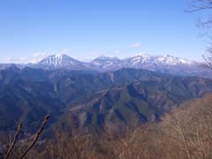 北の肩は東西に展望が開ける。西側は小来川の集落を俯瞰し、日光連山を遠望する。冠雪した女峰山、小真名子山、大真名子山、男体山が青空に稜線を連ねる山岳景観は素晴らしい。男体山の左奥には、真っ白な日光白根山の頂きも覗いている。