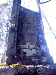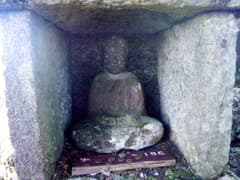 北の肩の大岩には5基の石祠が点在し、そのうち、お目当の石仏を納めた石祠が3基ある。偏平足さんの記事「石仏544鶏鳴山(栃木)神像」によると、これらは羽を持つので天狗と思しき石像であったり、正体不明の神像であったりする。誰が何時どのような意図でここに石仏を祀ったかも不明とのこと。いずれも東麓の方を向いて祀られている。個性的で謎な石像をじっくり見る。