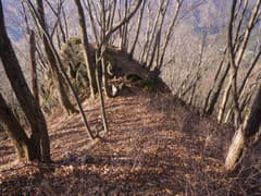 大きな岩が多数点在し、冬枯れの雑木が疎らに生える小尾根を急降下する。念のため、軽アイゼンと8mmロープを持参しているが、尾根筋を外さない限りは使わなくて済む。