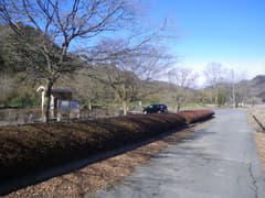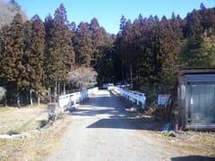 駐車場から出発して、川沿いの道を戻る。日陰には雪が残り、コチンコチンに凍結している。しかし、雪を踏んだのはここだけ。県道に出、追地口バス停を過ぎて「彼岸花群生地入口」の看板で左折。未舗装の林道に入り、粟野川に架かる名武戸橋を渡る。