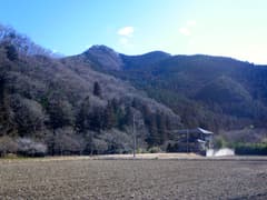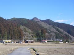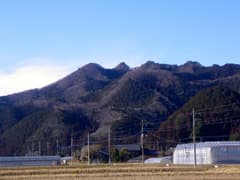 桐生を車で発ち、東北道・栃木ICから思川に沿って、登山口の中粟野に向かう。途中、ちょっとした街並みが広がる口粟野から、「山」の字を彷彿とさせる山容の三峰山や、のっさりした山容で頂上に電波塔が建つ谷倉山を展望する。どちらも低山ながら、なかなかの存在感がある山である。