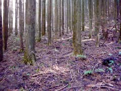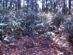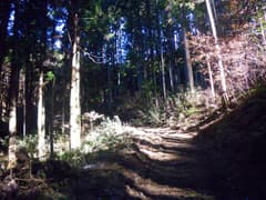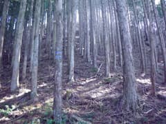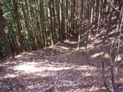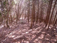 対岸に渡って直ぐの林道分岐を右へ。しばらく川に平行に進み、次の分岐を左折して、小さな窪に入る。傾斜がきつくなり、杉植林帯の中をジグザグに登ると、浅く緩い谷の中で林道の終点となる。この先に道はなく、右上の枝尾根の小鞍部を目指して、杉林の中の微かな踏み跡を登る。