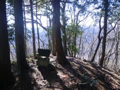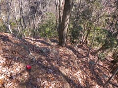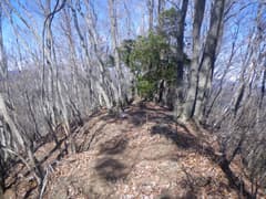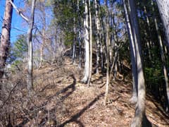 枝尾根に上がり、南峰に向かって登る。頂上直下はかなり急なので、途中から左に斜上して、西峰と南峰の鞍部に上がる。鞍部は杉林内の小広い平坦地となっており、痩せ尾根を想像していたのでちょっと意外。