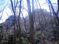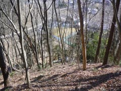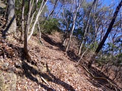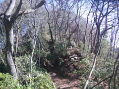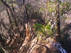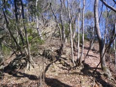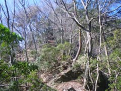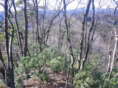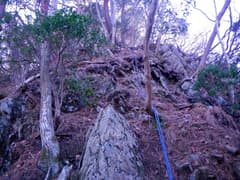 稜線は直ぐ先でY字に分岐し、右の主稜線を進むと、急斜面となって切れ落ちている。ここの下降は少々不安を感じるので慎重を期し、念の為に携行していた8mm×20mロープを出す。立木を支点にして垂らし、これを摑んで下る。下り着いた地点の先は傾斜が緩んで一安心。振り返ると西峰と三角点峰が険しく聳え、低山ながらなかなか奥山の雰囲気がある。