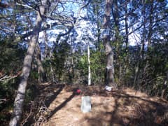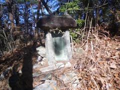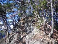 稜線を左へ登れば直ぐに西峰の頂上だが、先に三角点峰に登ろう。右に急降下し、アセビに覆われた鞍部から岩場の多い稜線をひと登りして頂上に着く。「三峰山」の山名標と三角点標石、それと木立に隠れて小さな石祠がある。頂上は松などの樹林に囲まれて狭く、南方向が見える程度だが、陽が差し込んで雰囲気は明るい。山専ボトルに入れてきたホットココアを飲み、パウンドケーキを軽く腹に入れる。
