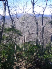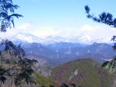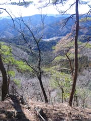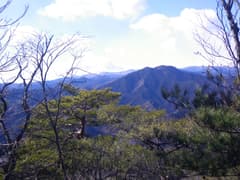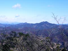 頂上は樹林に覆われて展望に乏しいので、少し休んだだけで先に進む。痩せ尾根を北西へ辿ると北面が垣間見える箇所があり、登ったことのある二股山や、未踏で興味を持っている「かまど倉」が眺められる。