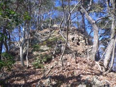 この先の稜線は高度を100m程落とし、目的地の431m三角点峰はまだまだ遠くに感じる。この辺りは冬枯れの雑木林に緑鮮やかなアセビが群生して綺麗だ。なおも岩稜のアップダウンが続く。やがて杉植林帯に入り、程なく403m標高点付近となる。太いアカマツに梵天が括り付けられ、塔身の潰れた石祠がある。最近も参拝されている様子があるが、どこを登って来るのだろう。