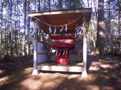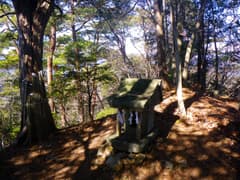 小さな登り返しのあと、常緑樹の低木帯に入るが、そこはかとなく踏み跡が続く。再び杉林に入り、ゆるゆると下って行くと、小屋の中に赤い祠が祀られた小さな神社に着く。祭神は分からないが、新しい注連縄が張られている。