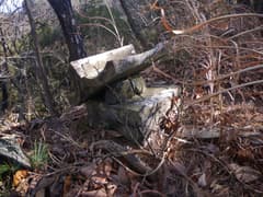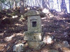 右に緩く登って南峰頂上に着く。木の間越しに口粟野の街並みや谷倉山、もう一方の三峰山の山影が見えるくらいで、展望に乏しい。塔身の潰れた石祠が南を向いて建っている。