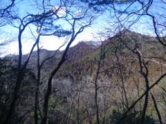 杉林に覆われた稜線上の微かな踏み跡を辿る。南斜面が若い杉植林帯となり、陽当たりが良いせいか低木が繁茂して、小枝が煩い。小藪の区間を抜けると、岩場が点在して松とアセビの多い明るい稜線となる。ここは快適に歩けるが、小さなアップダウンが多く、意外と時間がかかる。481m標高点の辺りで休憩し、ホットココアと残りのパウンドケーキを腹に入れる。陽が当たる所は暖かいが、じっとしているとさすがに風が冷たい。