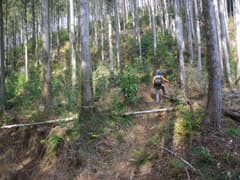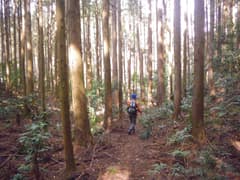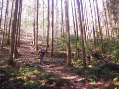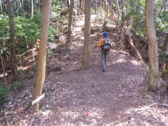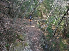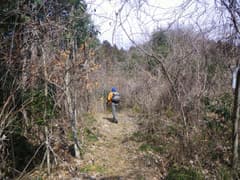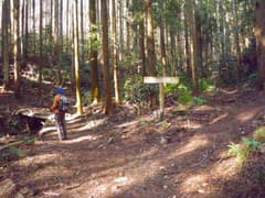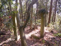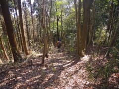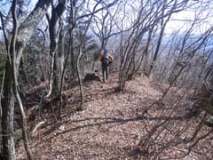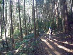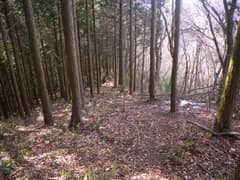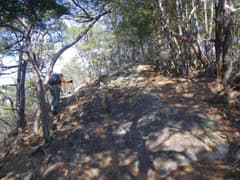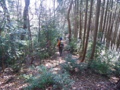 さらに尾根を緩く下る。左斜面は杉植林帯で、作業道が縦横に走っている。ところどころ雑木林の区間があり、露岩も点在して、この尾根道もなかなか良い雰囲気がある。