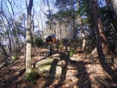次は男抱山に向かう。岩場を下って鞍部に着くと、左に半蔵山への道が分岐する。男抱山へは直進。大きな岩場を木の根、岩角を摑んで登ると、男抱山の頂上に着く。