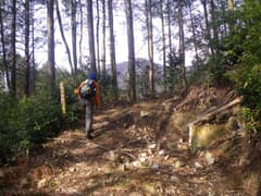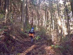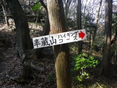 鞍部に戻り、「半蔵山ハイキングコース」の道標に従って、半蔵山に向かう登山道に入る。アオキと杉の林の中を緩く下り、鞍部から杉植林地の登りにかかる。尾根の左を絡んで幅広い山道を登る。この道は送電線の巡視路で、ところどころに巡視路の黄色い道標が設置されている。