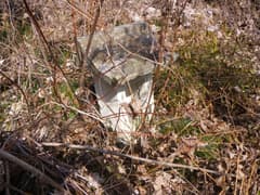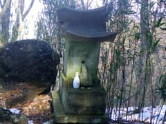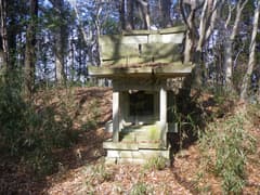 頂上の南の直下に巨大な石祠がある。比較的新しそうな祠だが、亀裂が入って崩壊しそうである。祭神は不明。石祠の周囲は陽だまりの平地になっていて、風も遮られ、休憩にもってこい。枯葉の上にシートを敷いて腰を下ろし、ゆっくり昼食とする。
