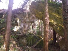 再び杉林の中に入ると、取り分け大きな岩場がある。ここも石切場の跡地のようだ。緩やかな尾根の登りから、右斜面の山腹をトラバースする道に入る。この辺りは雰囲気の良い自然林に覆われている。途中で半蔵山を往復して戻って来たご夫婦と行き合い、気持ち良い道ですねー、と挨拶を交わす。あれ、さっきも同じようなことを言った気が(^^;)