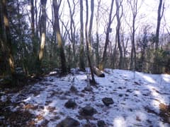 少し傾斜が増して杉林の中を登ると林道に出る。林道を右に辿り、再び杉植林帯の中の山道に入る。ゆるゆる登って稜線の上に出ると、雪が薄く積もっている。稜線の反対側は北西向きの急斜面で、意外と高度感があり、雑木林を透かして山麓を俯瞰する。遠くの日光連山は雪雲の中に霞み、そちらの方向から寒風が吹き付けて来る。