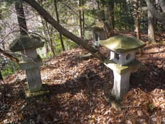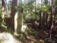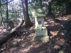 ここから南へ落ちる尾根を下る。明瞭な踏み跡を辿ると、直ぐに倒壊して柱だけとなった石鳥居が現れる。コンクリート造だから近代のものだが、倒れてからは久しい様子。