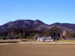 墓地を過ぎ、竹林の掘割道、畑地の脇道を通って、山麓の車道に出る。広々とした畑地から振り返ると、羽黒山と半蔵山が青空をバックにしてなだらかな稜線を延ばしている。山麓の集落にとっては日光連山からの寒風を遮るありがたい山なので、麓から三角形のピークが一番目立つ羽黒山が信仰の対象となったのだろう。富士山も富士山形の小振りな山容を見せている。