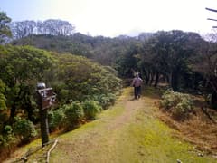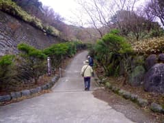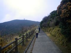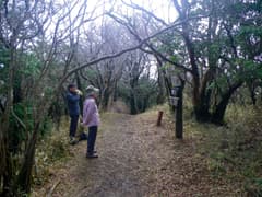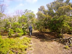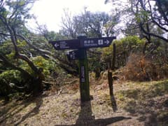 後藤山から、歪曲した枝振りのアセビの樹林をジグザグに下る。陽射しがアセビの緑に照り映えて綺麗だ。芝生が広がって公園のような鞍部から、緩やかに上下する稜線を辿る。やがて、急坂に差し掛かり、道がぬかるんで歩きにくい個所があるが、長くはない。登り着いた所には「展望台→」との道標があり、直ぐ先が展望台だ。