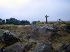 アセビの樹林帯に入って短い急坂を登り、電波塔の横を通って金冠山の頂上に着く。丈の低い笹原に露岩が点在し、なかなか良い雰囲気。「金冠山 昭和廿九年十一月三日 戸田村 青年団 観光課」と刻まれた小さな石碑が建つ。晴れていれば駿河湾の向こうに富士山を遠望することができるはずだが、今日は曇っていて見えないのは残念。