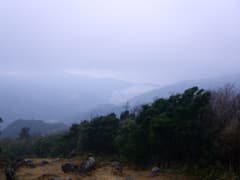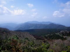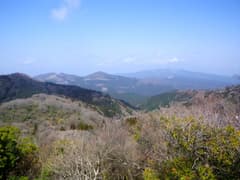 展望台からはほぼ360度の眺めが得られる。どちらを見ても鮮やかな緑を散りばめた緩やかな山並みが広がる。北方の魂ノ山の右奥には、左右に長く緩やかな稜線を引く達磨山を遠望する。南方に見える山影は長九郎山のようだ。靄に霞むが海岸線も見ることができ、半島の山らしい景観が広がる。