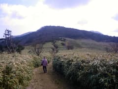簡易舗装された遊歩道を緩く登ると、行く手に電波塔の建つ金冠山頂上が現われる。今日は雲が多くてクリアな眺めは得られないが、左(西)側には戸田港が俯瞰できる。海が見える山歩きは結構好き。程なくなだらかな笹原の切り開き道となり、右にだるま山高原への道を分ける。