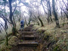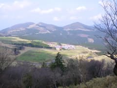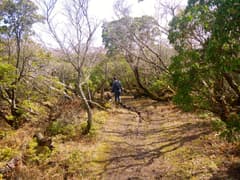 ナベ岩から笹原を抜けてアセビ林に入り、後藤山の登りに取り付く。振り返ると放牧場の緩斜面の中に牛舎の褐色の屋根が見えている。木の階段が整備された道を登って、後藤山の平坦な頂上に着く。樹林に囲まれて展望はない。