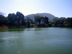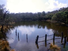 展望台から猫越岳頂上までは、ほとんど平坦な台地の上を進む。途中に猫越岳山頂の池がある。静まり返った水面に周囲の樹林と空を映す神秘的な池だ。説明板によると、猫越岳は60〜100万年前に噴火した猫越火山が侵食された名残の山で、この池は山頂付近の厚い溶岩の上に水が溜まったものとのこと。