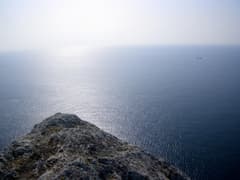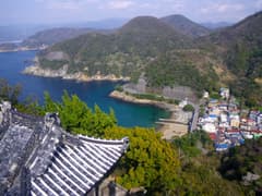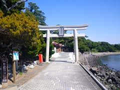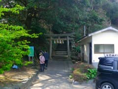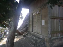 本殿脇の石段を攀じ登ると岩峰の天辺の展望台に立つことが出来る。展望台からの眺めは360度。特に南の眺めが素晴らしく、海岸線は険しい岩壁を連ね、千貫門と呼ばれる岩峰の小島は絶景である。足元はスッパリと切れ落ち、眼下の海は青緑色に透き通って、深い海の底まで見える。