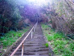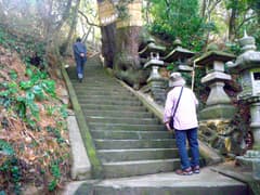 石段を上がると拝殿があり、その先にさらに急で長い(約320段の)石段が続く。登るに連れて反り返るように傾斜が増し、手摺をしっかり摑んでいないと後ろにひっくり返りそうである。危ないのでS&Sはここまで。私だけ頂上を目指す。