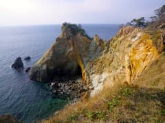 宿へ戻る途中、もう一箇所、海岸線の景勝地として黄金崎(こがねざき)に立ち寄る。こちらは岬の直ぐ近くまで車で入ることができ、新しい歩道も整備されていて、観光客が多い。黄白色の崖が夕陽に照らされると黄金色に輝くことから、この名前があるとか。また、岬の形が馬に見えることをPR中らしい。岬の風景を楽しんだのち、宿に帰った。