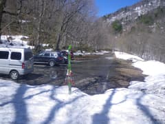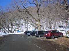 ゲレンデからすっかり雪が消えたスノーパーク尾瀬戸倉を突っ切り、完全に除雪された舗装道を走って富士見下に向かう。たまに路面に転がっている岩には要注意。富士見下の駐車場には車3台しかなく、余裕で駐車可能。雪の上にはスノーモビルが2台置かれている。