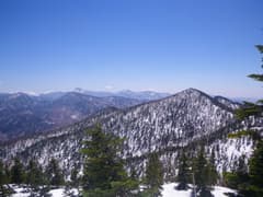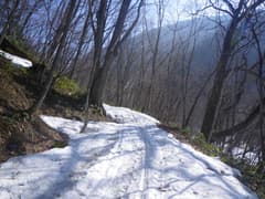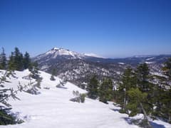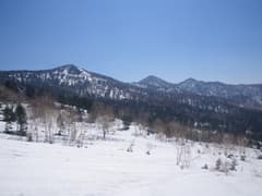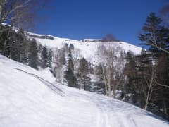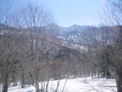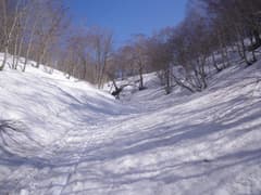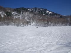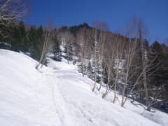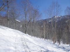 ルートは山腹をトラバースして緩く登っていく。途中で、スノーモビル2台に追い抜かれる。ブナの木立の間から冬路沢を隔てて、二つの綺麗な三角ピークを並べる荷鞍山を望む。こちら側の斜面は黒々とした樹林に覆われて険しく、なかなか立派な山容である。その左には、白尾山の円やかな頂があり、頂上に建つマイクロ波中継塔に日光が反射して光って見えている。白尾山からこちらへ落ちる尾根は緩く、樹林も疎らで滑るのに良さそう。ただし、冬路沢からは水音が聞こえてくるので、渡渉点があるかどうかが問題だ。