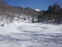 ブナ林を緩く登ると、次は雪に覆われているが表面が解け始めた池(馬洗淵)が現れる。アヤメ平の白い稜線を背景に配し、なかなか良い景色である。