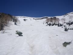 やがてルートは浅い谷に入って登る。途中、雪が割れている個所があった。この暑さではどんどん雪も薄くなるだろうな。谷の底を避け、斜面をトラバースして登る。
