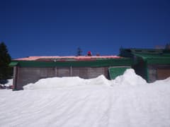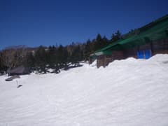 小屋周辺は二階の高さまで雪があり、WCも雪に埋もれている。屋根の雪は下ろされて、スノーモビルで来た小屋のスタッフ(おじさん2人)が布団を干していた。よく見ると屋根の軒先は雪の重みで曲がり、トタンが捲れている。小屋の維持管理は大変である。