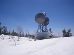 一休みしたのち、白尾山に向かう。オオシラビソの樹林の薄いところを縫って、広く緩やかな稜線を登る。高みを目指すとマイクロ波中継塔があり、四方の展望が開ける。頂上へ緩やかな起伏のあるだだっ広い稜線が続き、まさに白銀世界の散歩。最後に短い坂を上がって、白尾山の頂上に登り着く。
