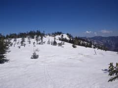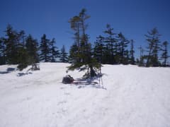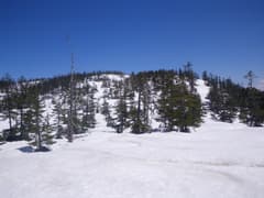 シールを外し、転倒に備えてジャケットを着て、広く緩い稜線を滑る。ザラメ雪なので快適にターン出来るが、この暑さで雪面が湿っているせいか、スピードはあまり出ない。