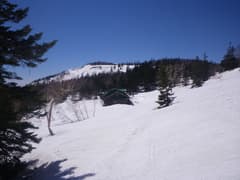 雪がたっぷりと残る山腹をトラバースして緩く登り、冨士見小屋に到着。小屋の前で大休止とし、テルモスのホットココアを飲んで、チョコレートを齧る。程なくご夫婦パーティも到着。話を伺うと、やはり鳩待峠の混雑を避けてこちらに来たとのこと。
