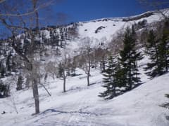 少しずつ高度が上がると、ブナ林からオオシラビソの樹林帯となり、アヤメ平の白い稜線が視野に入って来る。先行して歩いていたご夫婦のパーティに追いつき、挨拶して先に行かせて貰う。アヤメ平の稜線の下は広々とした雪斜面となっていて、見上げると雪庇から巨大な雪のブロックが落ちている。なので、通過するときはあまりのんびりしない方が良いが、木立が切れて展望が良いので、急いで写真を撮っておく。