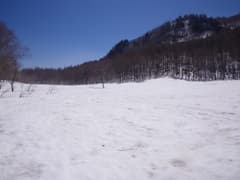 冨士見小屋に戻り、往路を滑って富士見下に向かう。林道に沿ってほぼ直滑降なので、ターン出来る斜面はあまりないが、下りは楽チンなので、これはこれで楽しい。冨士見小屋から1時間弱で、車を置いた富士見下に帰り着く。軽い行程だったが、尾瀬の雪山で散歩が楽しめて良かった。そして、この暑さで雪解けが加速するから、今シーズンはもう残雪の山は終わりかなあ。ちょっと名残惜しい気持ちを抱いて、帰途につく。